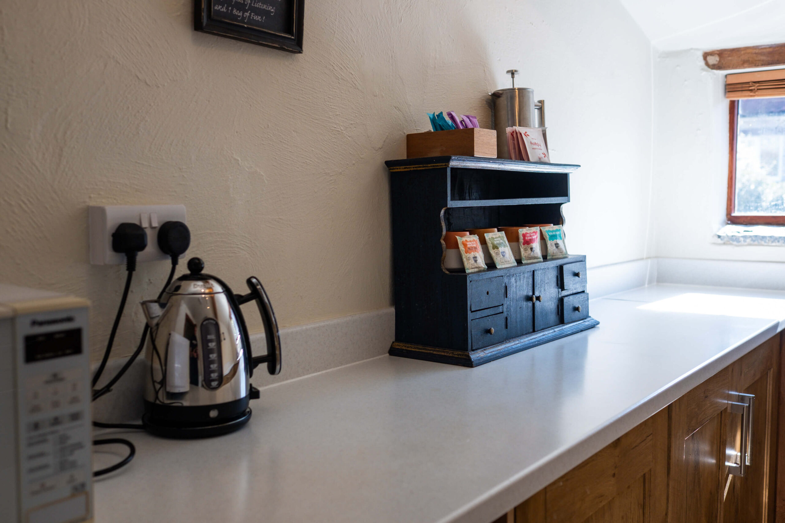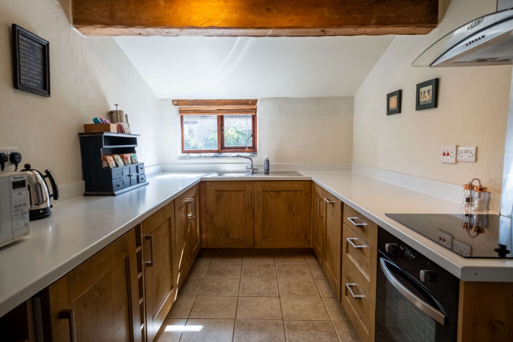 The lounge has two sofas. Within the lounge is a dining area with a table and 4 chairs. Down a single step brings you to a newly renovated kitchen with plenty of space for cooking. There is a fridge and a freezer in this cottage. We have plenty of cookbooks in the Annex so combine that with the great Somerset produce in the farm shop and you will definitely be inspired to cook.